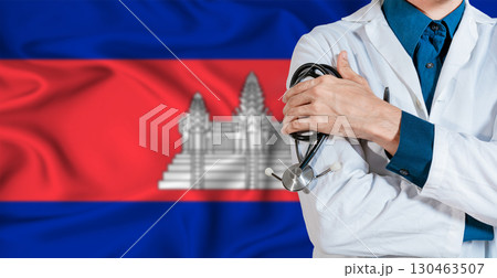 Doctor with stethoscope on Cambodia flag. Doctor holding stethoscope on Cambodia flag