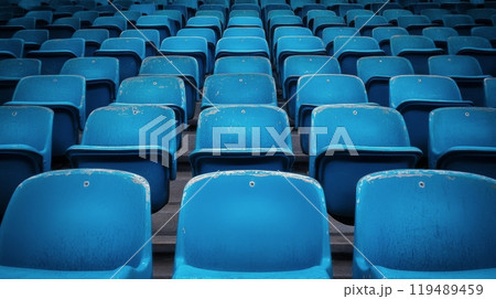 Blue stadium seats arranged in rows at a sports venue ready for upcoming event