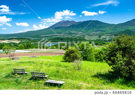 愛妻家の丘から望む夏の浅間山と嬬恋村の景色