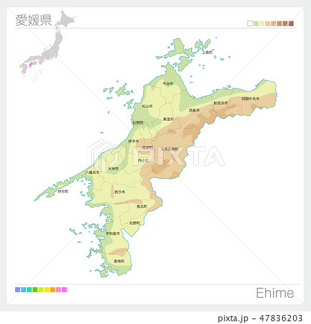 愛媛県の地図(等高線・色分け・市町村・区分け)