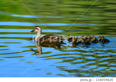 初夏の公園の池で子育てをする身近な野鳥、人気者のカルガモ