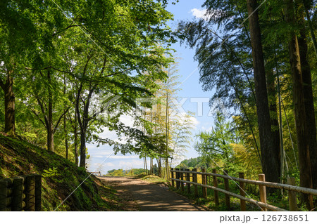 神奈川県立あいかわ公園 入口広場の新緑と冒険の森入口