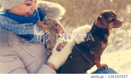 Young woman joyfully walking excited dog in snowy landscape, capturing the essence of winter solstice and cozy outdoor lifestyle