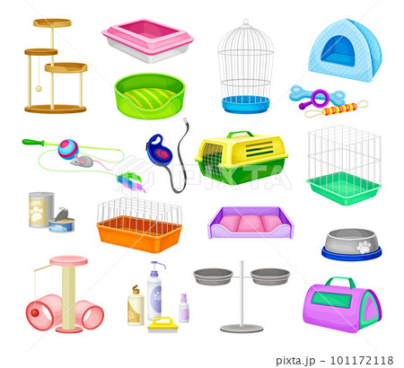 Pet Shop or Store Accessories with Cage and Cat Tree Big Vector Set