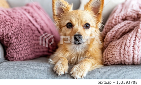 Cute small dog resting on a cozy couch with fluffy pink pillows in a bright living room