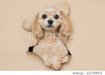 背景紙から顔を出す犬