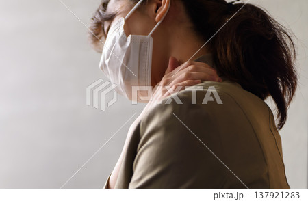 肩の痛みを訴えるマスク姿の女性