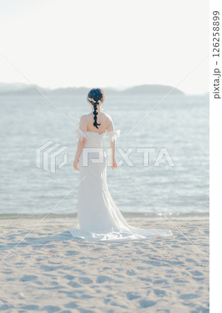 海辺の逆光に浮かぶウェディングドレス姿の女性のポートレート