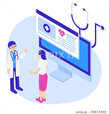 自宅で医師の診察を受けるオンライン診療のアイソメトリックイラスト