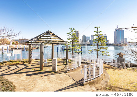 日本の東京都市景観 相生橋たもとの江東区立「中の島公園」などを望む(画面右奥は豊洲)