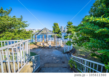日本の東京都市景観 相生橋たもとの江東区立「中の島公園」などを望む(画面左奥は豊洲)