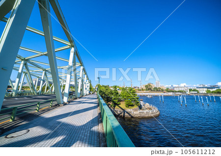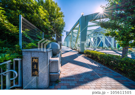 日本の東京都市景観 相生橋たもとの江東区立「中の島公園」への出入口(画面左)など