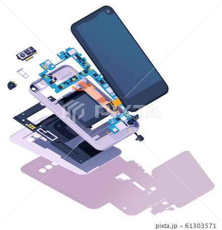 Phone repair service. Disassembled smartphone. Case and electronic parts or components on scheme of abstract mobile phone. CPU, motherboard of smartphone. Non-assembled cellphone. Isometric concept.