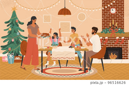 Family Christmas dinner at home, vector illustration. People sitting at festive served decorated table. Merry christmas and new year holiday celebration party