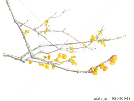 水彩:枝付きロウバイ 蝋梅 花 植物 素材 白バック 透過 コピースペースあり