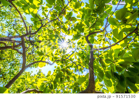 日本の植物風景 太陽光とハクモクレンの新緑。エコロジー、高潔な心、自然への愛などのイメージ…=横浜