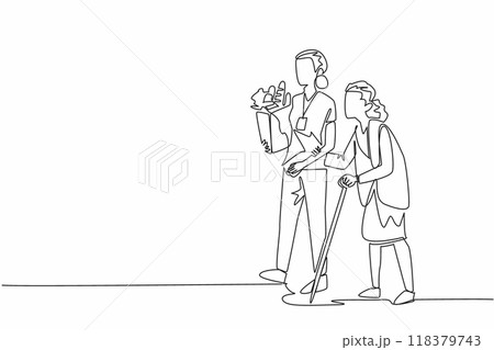 Continuous one line drawing a young woman helps old grandmother walk with stick. Help ease the burden on the elderly. Volunteer. World Social Work Day. Single line draw design vector illustration
