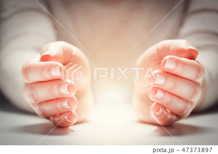 Light between woman's hands in gesture of protection, care.