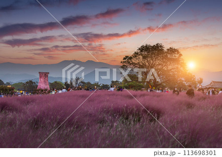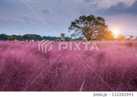 Pink Muhly Grass at sunset Near Cheomseongdae in Gyeongju, Gyeongsangbuk-do, South Korea.