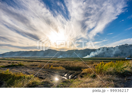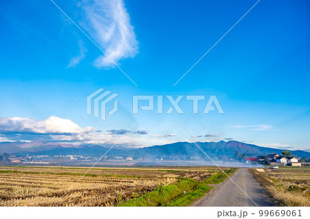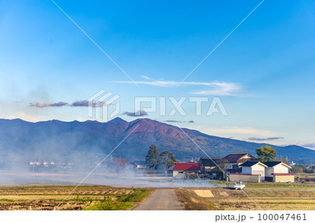田園風景 野焼き 福島県喜多方市 磐梯山
