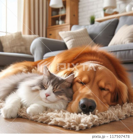 リビングで寄り添って寝ている大型犬と猫