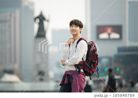 A young man traveling in Seoul, South Korea, with a backpack