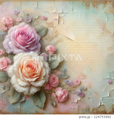 A vintage-inspired, floral art featuring pastel roses and love letters with cracked paint and faded textures. Fine gold accents and soft lighting create an elegant, nostalgic atmosphere.