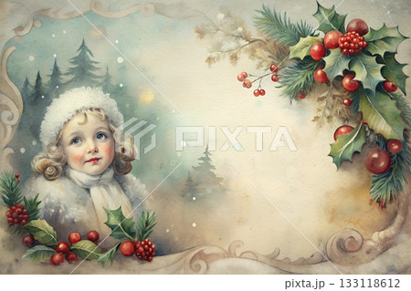 Vintage Christmas Portrait of Little Girl in Winter Coat with Holly, Watercolor Style with Copy Space