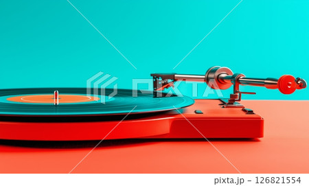 Vintage red turntable playing vinyl record on vibrant turquoise background