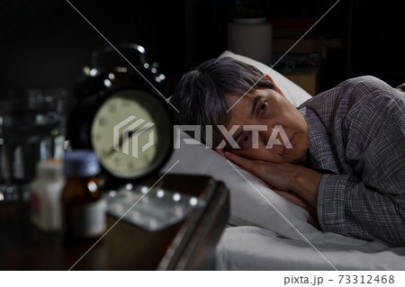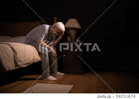 Depressed senior person sitting in bed cannot sleep from insomnia