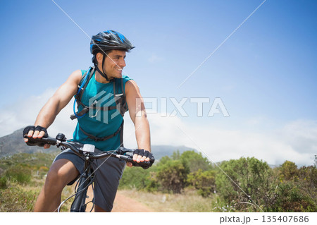 Male cyclist riding mountain bike along dusty dirt trail wearing helmet, hydration pack, gloves