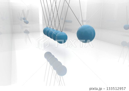 3D illustration showing glossy blue pendulums hanging in reflective chamber with mirror reflections