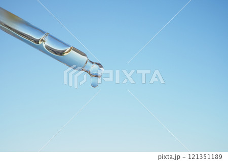 Close-up of a Droplet from a Pipette Against a Clear Blue Sky