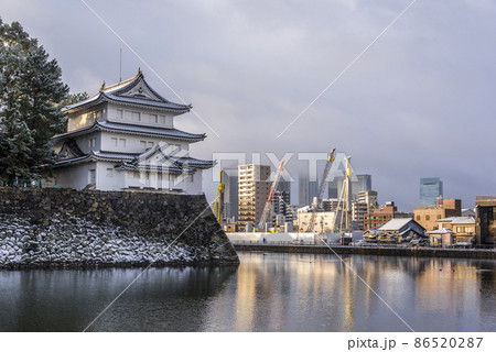 《愛知県》雪の名古屋城西北隅櫓と高層ビル群