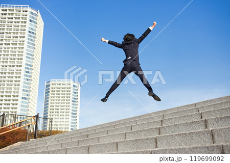 ビジネスイメージ スーツ姿でジャンプする若い男性
