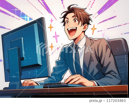 パソコン画面を見て満面笑顔で嬉しそうなビジネスマン