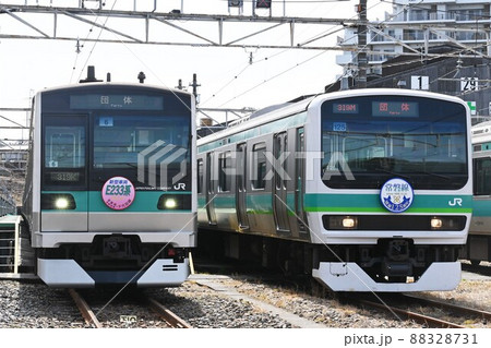 車両基地で並ぶ常磐線のE233系2000番台とE231系