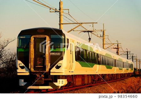 夕陽に赤く染まるE257系 特急開運成田山初詣武蔵野号