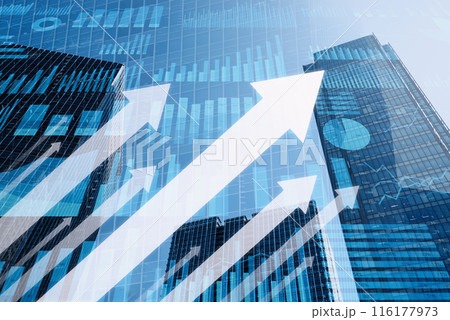 成功している成長企業のイメージ。好景気と好業績。財務のグラフと高層ビルを背景に多数の矢印。