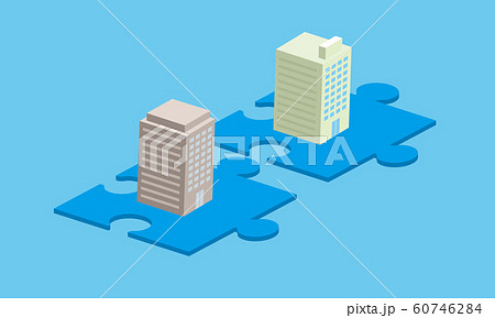 経営統合、オフィスビルとパズルのイメージ