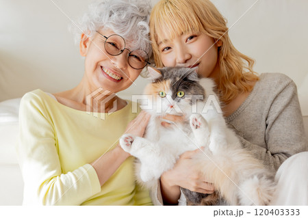 猫を抱っこする日本人シニア女性