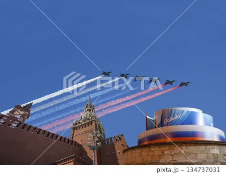 Moscow Kremlin, Russia -- Victory Day celebration (WWII), and Russian military aircraft with painted russian flag, Russia