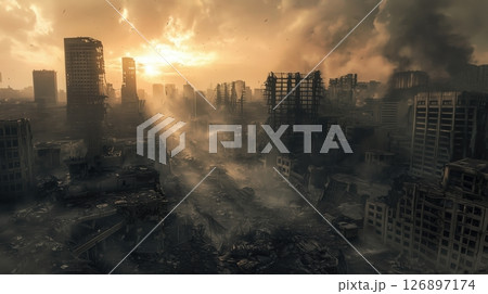 ホラーゲーム背景風 倒壊した現代都市の街と瓦礫がある風景