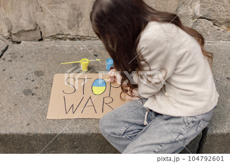 Little girl drawing a poster with blue and yellow colors. Young pretty girl writing a word Stop War. Girl supporting Ukraine.