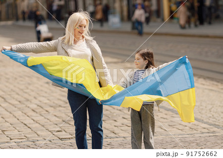 Young mother and her daughter standing on the street of old town. Girl and woman holding big flags of Ukraine in blue and yellow colours. Woman and girl supporting Ukraine against war.