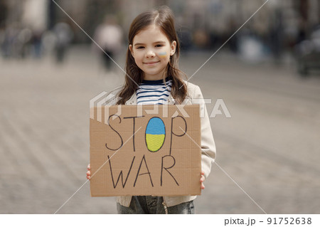 Little girl holding a poster with blue and yellow colors. Young pretty girl has a poster with words Stop War on it. Girl supporting Ukraine.