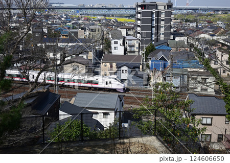 松戸市街と常磐線、E657系、戸定ヶ丘歴史公園から