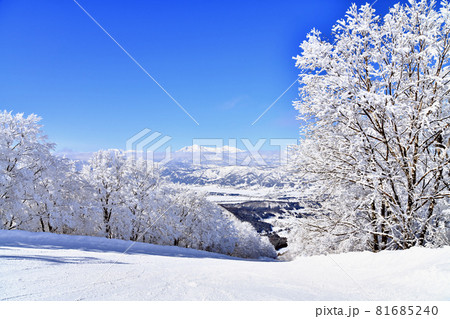 快晴のスキー場のゲレンデ高所から見渡す冬の風景 (長野県、飯山市、戸狩温泉)