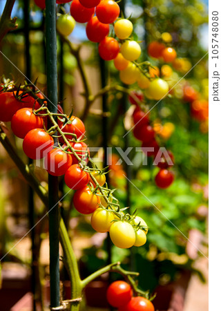 フレッシュ 収穫前のミニトマト プランター栽培
