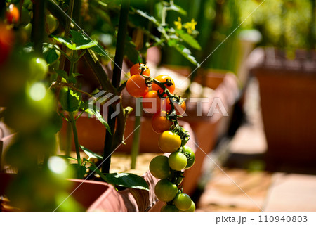 ルーフバルコニーで沢山のミニトマトをプランター栽培 カラフルなトマトがとてもきれい 夏の景色